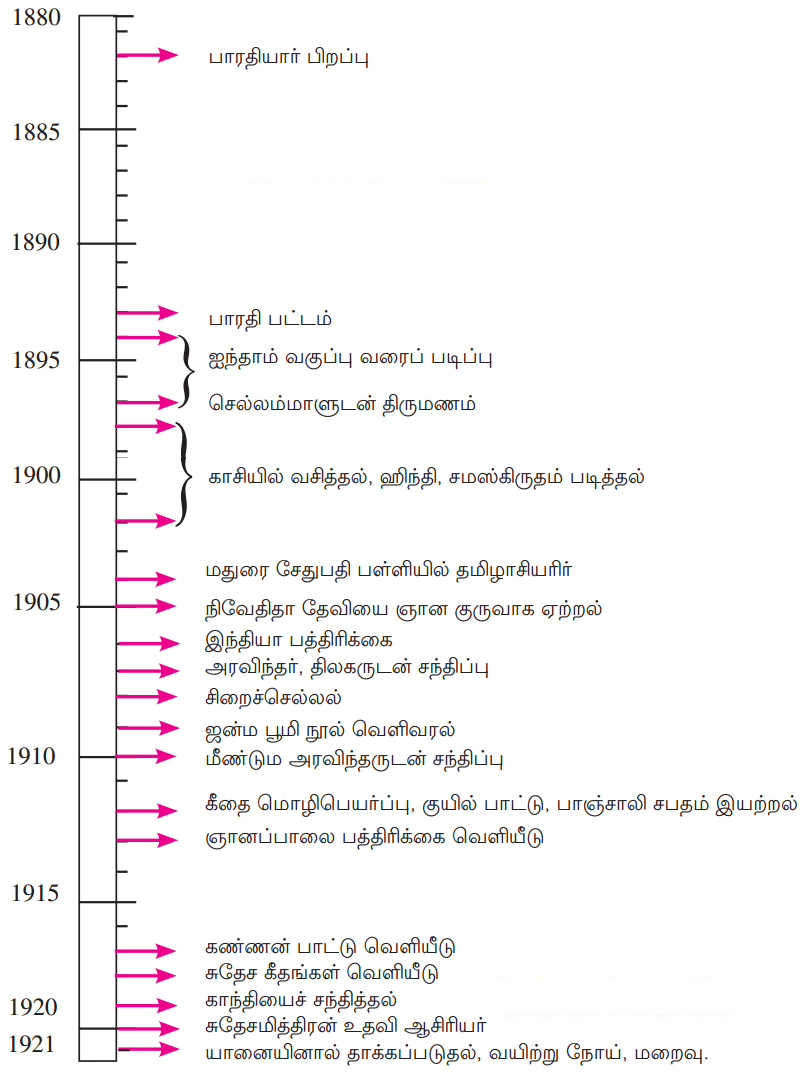 பாரதியின் வாழ்வினைக் காலக்கோடாக உருவாக்குக.