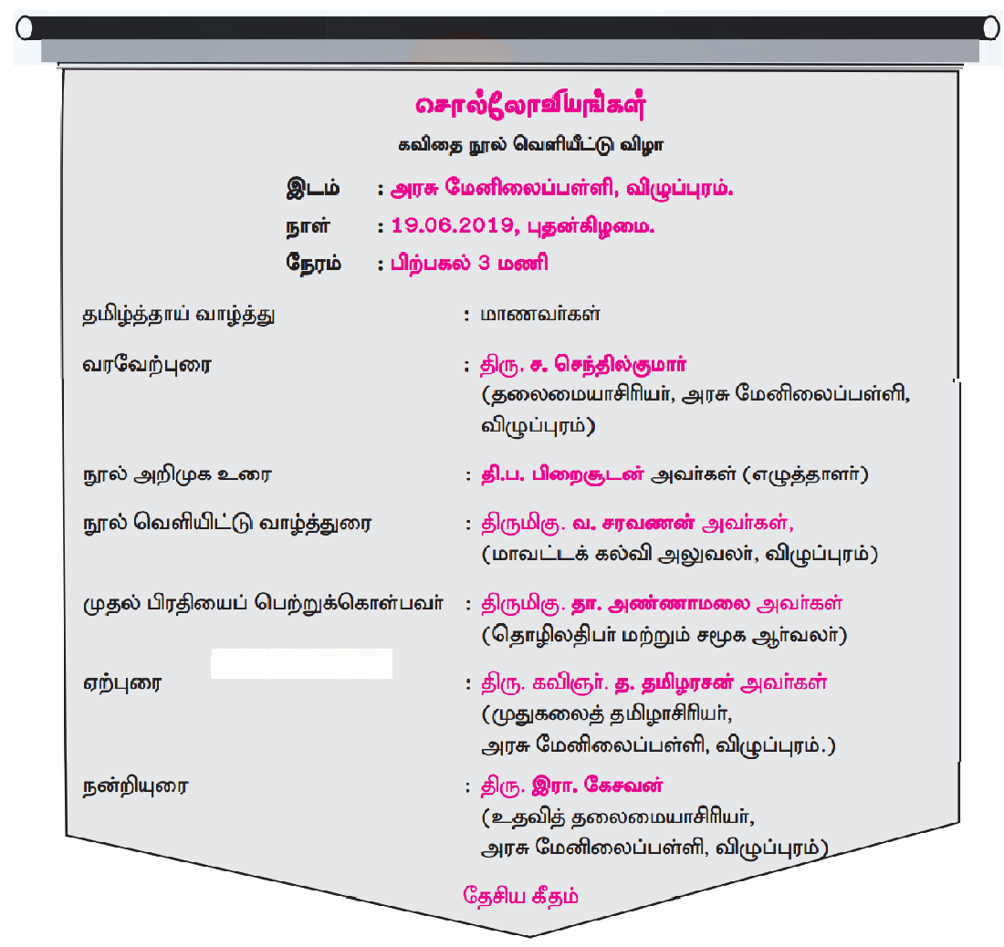 “சொல்லோவியங்கள்” (கவிதை) என்னும் நூல் உங்கள் பள்ளி ஆசிரியரால் எழுதப்பட்டு உங்கள் பள்ளியில் வெளியிடப்படுகிறது. அவ்வெளியீட்டு விழாவிற்கான நிகழ்ச்சி நிரலை உருவாக்கி, நன்றியுரை ஒன்றை எழுதுக.