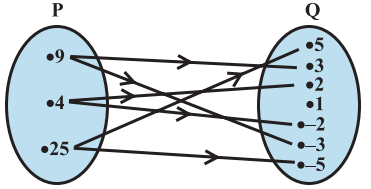 Fig 2.5 between the sets $\mathrm{P}$ and $\mathrm{Q}$. Write this relation (i) in set-builder form, (ii) in roster form. What is its domain and range?