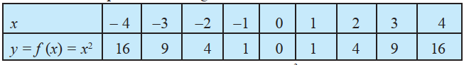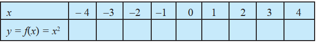 Define the function $f: \mathbf{R} \rightarrow \mathbf{R}$ by $y=f(x)=x^2, x \in \mathbf{R}$. Complete the Table given below by using this definition. What is the domain and range of this function? Draw the graph of $f$.