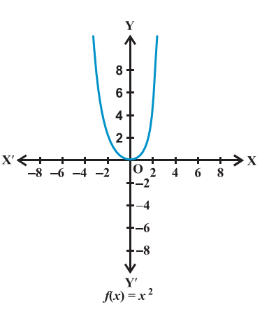Domain of $f=\{x: x \in \mathbf{R}\}$. Range of $f=\left\{x^2: x \in \mathbf{R}\right\}$. The graph of $f$ is given by Fig 2.10