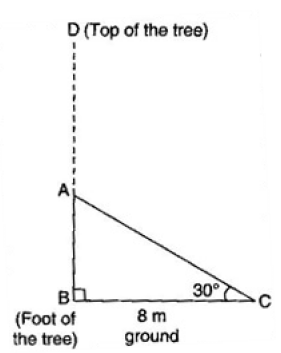 A tree breaks due to storm and the broken part bends so that the top of the tree touches the ground making an angle $30^{\circ}$ with it. The distance between the foot of the tree to the point where the top touches the ground is $8 \mathrm{~m}$. Find the height of the tree.
