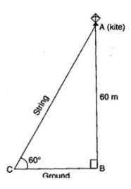 A kite is flying at a height of $60 \mathrm{~m}$ above the ground. The string attached to the kite is temporarily tied to a point on the ground. The inclination of the string with the ground is $60^{\circ}$. Find the length of the string, assuming that there is no slack in the string.