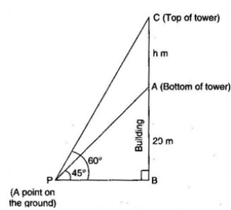 From a point on the ground, the angles of elevation of the bottom and the top of a transmission tower fixed at the top of a $20 \mathrm{~m}$ high building are $45^{\circ}$ and $60^{\circ}$ respectively. Find the height of the tower.