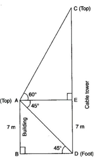 From the top of a $7 \mathrm{~m}$ high building, the angle of elevation of the top of a cable tower is $60^{\circ}$ and the angle of depression of its foot is $45^{\circ}$. Determine the height of the tower.