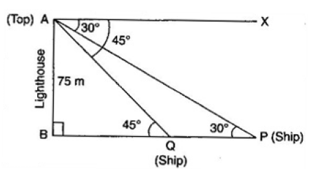As observed from the top of a $75 \mathrm{~m}$ high lighthouse from the sea-level, the angles of depression of two ships are $30^{\circ}$ and $45^{\circ}$. If one ship is exactly behind the other on the same side of the lighthouse, find the distance between two ships.