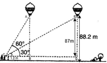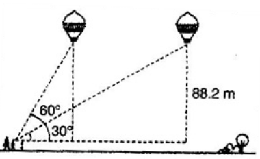 A $1.2 \mathrm{~m}$ tall girl spots a balloon moving with the wind in a horizontal line at a height of $88.2 \mathrm{~m}$ from the ground. The angle of elevation of the balloon from the eyes of the girl at any distant is $60^{\circ}$ After some time, the angle of elevation reduces to $30^{\circ}$ (see figure). Find the distance travelled by the balloon during the interval.