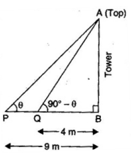 The angles of elevation of the top of a tower from two points at a distance of $4 \mathrm{~m}$ and $9 \mathrm{~m}$ from the base of the tower and in the same straight line with it are complementary. Prove that the height of the tower is $6 \mathrm{~m}$.
