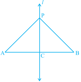 Line $l \perp \mathrm{AB}$ and passes through $\mathrm{C}$ which is the mid-point of $\mathrm{AB}$ (see Fig. 7.9). You have to show that $\mathrm{PA}=\mathrm{PB}$. Consider $\triangle \mathrm{PCA}$ and $\triangle \mathrm{PCB}$.