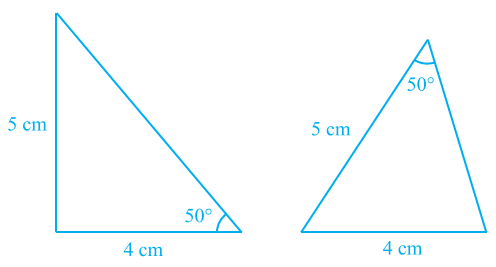 Now, let us construct two triangles, whose sides are $4 \mathrm{~cm}$ and $5 \mathrm{~cm}$ and one of the angles is $50^{\circ}$ and this angle is not included in between the equal sides (see Fig. 7.10). Are the two triangles congruent?