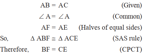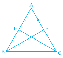 $\mathrm{E}$ and $\mathrm{F}$ are respectively the mid-points of equal sides $\mathrm{AB}$ and $\mathrm{AC}$ of $\triangle \mathrm{ABC}$ (see Fig. 7.28). Show that $\mathrm{BF}=\mathrm{CE}$.