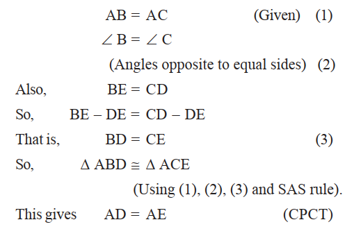 In an isosceles triangle $\mathrm{ABC}$ with $\mathrm{AB}=\mathrm{AC}, \mathrm{D}$ and $\mathrm{E}$ are points on $\mathrm{BC}$ such that $B E=C D$ (see Fig. 7.29). Show that $A D=A E$.