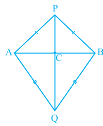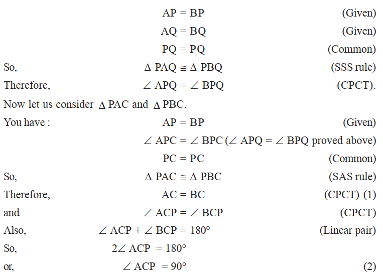 You are given that $\mathrm{PA}=\mathrm{PB}$ and $\mathrm{QA}=\mathrm{QB}$ and you are to show that $\mathrm{PQ} \perp \mathrm{AB}$ and $P Q$ bisects $A B$. Let $P Q$ intersect $A B$ at $C$.