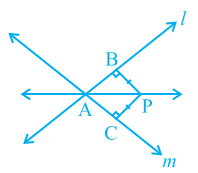 You are given that lines $l$ and $m$ intersect each other at A. Let $\mathrm{PB} \perp l$, $\mathrm{PC} \perp m$. It is given that $\mathrm{PB}=\mathrm{PC}$.