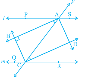 It is given that $\mathrm{PS} \| \mathrm{QR}$ and transversal $p$ intersects them at points $\mathrm{A}$ and C respectively.
