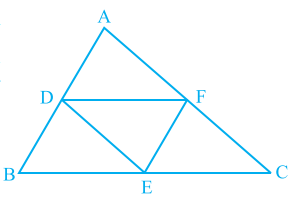 In $\triangle \mathrm{ABC}, \mathrm{D}, \mathrm{E}$ and $\mathrm{F}$ are respectively the mid-points of sides $\mathrm{AB}, \mathrm{BC}$ and $\mathrm{CA}$ (see Fig. 8.18). Show that $\triangle A B C$ is divided into four congruent triangles by joining $\mathrm{D}, \mathrm{E}$ and $\mathrm{F}$.