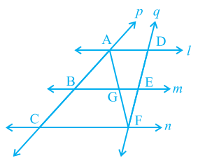 l,m and $n$ are three parallel lines intersected by transversals $p$ and $q$ such that $l, m$ and $n$ cut off equal intercepts $\mathrm{AB}$ and $\mathrm{BC}$ on $p$ (see Fig. 8.19). Show that $l, m$ and $n$ cut off equal intercepts $\mathrm{DE}$ and $\mathrm{EF}$ on $q$ also.