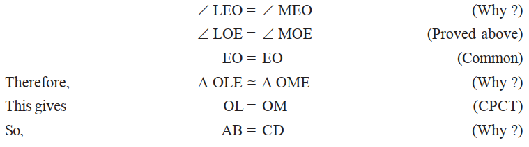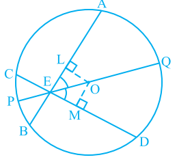 Given that $\mathrm{AB}$ and $\mathrm{CD}$ are two chords of a circle, with centre $O$ intersecting at a point E. PQ is a diameter through $\mathrm{E}$, such that $\angle \mathrm{AEQ}=\angle \mathrm{DEQ}$ (see Fig.9.11). You have to prove that $A B=C D$. Draw perpendiculars OL and OM on chords $\mathrm{AB}$ and CD, respectively. Now
