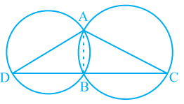 Two circles intersect at two points A and $\mathrm{B} . \mathrm{AD}$ and $\mathrm{AC}$ are diameters to the two circles (see Fig. 9.21). Prove that B lies on the line segment DC.