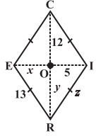 RICE is a rhombus (Fig 3.30). Find $x, y, z$. Justify your findings.