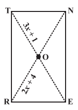 RENT is a rectangle (Fig 3.35). Its diagonals meet at O. Find $x$, if $\mathrm{OR}=2 x+4$ and $\mathrm{OT}=3 x+1$.