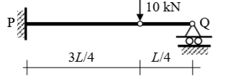 A vertical load of $10 \mathrm{kN}$ acts on a hinge located at a distance of $L / 4$ from the roller support $\mathrm{Q}$ of a beam of length $L$ (see figure). The vertical reaction at support $\mathrm{Q}$ is
