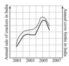 In a detailed study of annual crow births in India, it was found that there was relatively no growth during the period 2002 to 2004 and a sudden spike from 2004 to $2005 .$ In another unrelated study, it was found that the revenue from cracker sales in India which remained fairly flat from 2002 to 2004 , saw a sudden spike in 2005 before declining again in 2006 . The solid line in the graph below refers to annual sale of crackers and the dashed line refers to the annual crow births in India. Choose the most appropriate inference from the above data.
