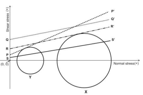 A rock follows Mohr-Coulomb failure criterion. Which one of the Mohr-Coulomb failure envelopes shown below allows failure of the rock under stress state $\mathrm{Y}$, but not under stress state X?