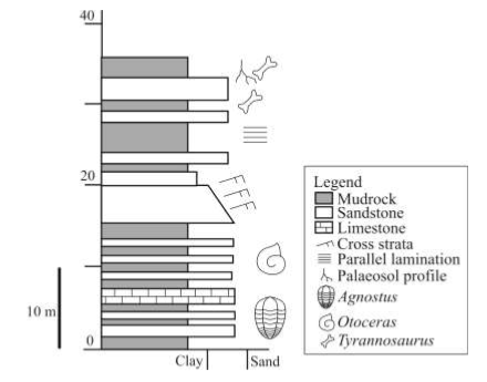 (A) The rocks range from Cambrian to Cretaceous and show change in depositional environment from marine to continental.
