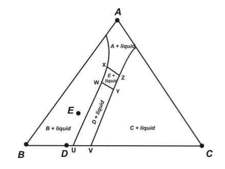 Liquid (at $\mathrm{W}$ ) $+\mathrm{B}+\mathrm{D}=\mathrm{E}$