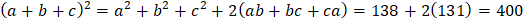 The sum of the square of three numbers is 138, while the sum of their products taken two at a time is 131. Their sum is |