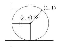is a square of unit area. A circle is tangent to two sides of  and passes through exactly one of its vertices. The radius of the circle is