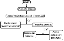 With the help of the following, identify the correct sequence, that leads to the formation of blood clot I. Blood clot II. Injury III. Factor II IV. Factor III V. Factor IV VI. Fibrinogen VIII. Thorambin |