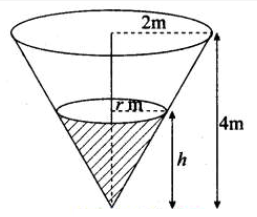 In order to eliminate $r$ we use similar triangles in diagram to write $\frac{r}{h}=\frac{2}{4} \Rightarrow r=\frac{h}{2}$ and the expression for $\mathrm{V}$ becomes $\mathrm{V}=\frac{1}{3} \pi\left(\frac{h}{2}\right)^2 h=\frac{\pi}{12} h^3$.