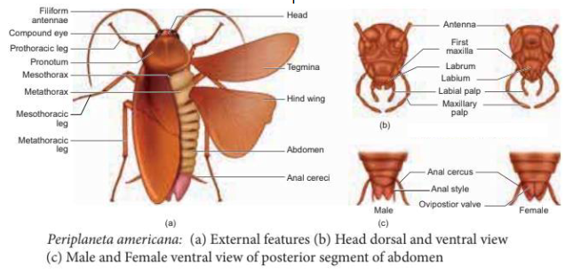 The body of cockroach is compressed dorso - ventrally, bilaterally symmetrical and segmented. The body is divisible into head, thorax and abdomen. The entire body is covered by a hard, brown, chitinous exoskeleton. In each segment.