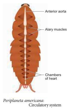 The heart consists of 13 chambers with ostia on either side. The blood from the sinuses enters the heart through the ostia and is pumped anteriorly to sinuses again. The triangular muscles that are responsible for blood circulation in the cockroach are called alary muscles (13 pairs). One pair of these muscles is found in each segment on either side of the heart. In cockroach, there is an accessory pulsatile vesicle at the base of each antenna which also pumps blood.