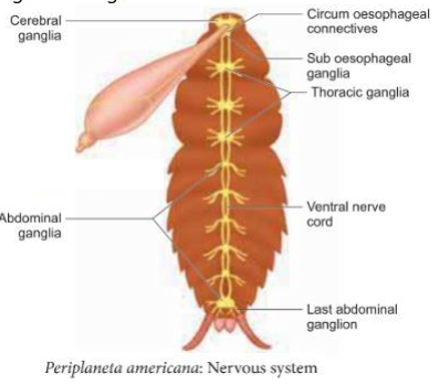 The nervous system of cockroach consists of a nerve ring and a ganglionated double ventral nerve cord. suh-oesophageal ganglion. circum - oesophageal̀ connectives and double ventral nerve cord (see figure). The nerve ring is present around the ocsophagus in the head capsule and is formed by the supra-oesophagial ganglion called the 'brain'. The brain is mainly a sensory and an endocrine centre and lies above the oesophagus. Sub - oesophageal ganglion is the motor centre that controls the movements of the mouth parts, legs and wings.