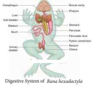 The alimentary canal consists of the buccal cavity, pharynx, oesophagus, duodenum, ileum and the rectum which leads to the cloaca and opens outside by the cloacal aperture. The wide mouth opens into the buccal cavity. On the floor of the buccal cavity lies a large muscular sticky tongue.