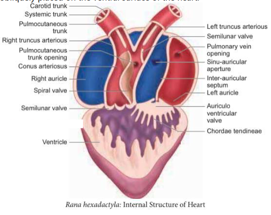 Blood vascular system consists of a heart with three chambers, blood vessels and blood. Heart is covered by a double- walled membrane called pericardium. There are two thin walled anterior chambers called auricles (Atria) and a single thick walled posterior chamber called ventricle. Sinus venosus is a large, thin walled, triangular chamber, which is present on the dorsal side of the heart. Truncus arteriosus is a thick walled and cylindrical structure which is