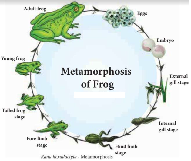 Within few days of fertilization, the eggs hatch into tadpoles. A newly hatched tadpole lives off the yolk stored in its body. It gradually grows larger and develops three pairs of gills. The tadpole grows and metamorphosis into an air-breathing carnivorous adult frog (Figure). Legs grow from the body, and the tail and gills disappear. The mouth broadens, developing teeth and jaws, and the lungs become functional