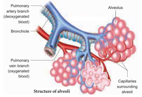 The fine respiratory bronchioles terminate into highly vascularised thin-walledpouch like air sacs called alveoli. It is made up of thin squamous epithelial