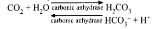 $\rightarrow$ At the tissues the $\mathrm{pCO}_2$ is high due to catabolism and diffuses into the blood to form $\mathrm{HCO}_2$ and $\mathrm{H}^{+}$ions. When $\mathrm{CO}_2$ diffuses into the $\mathrm{RBCs}$, it combines with water forming carbonic acid $\left(\mathrm{H}_2 \mathrm{CO}_2\right)$ catalyzed by carbonic anhydrase. Carbonic acid is unstable and dissociates into hydrogen and bicarbonate ions.