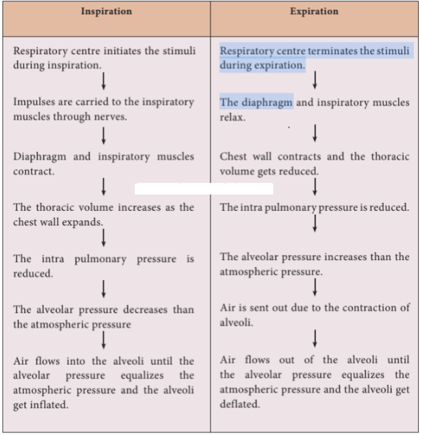The movement of air between the atmosphere and the lungs is known as ventilation or breathing. Inspiration and expiration are the two phases of breathing. Inspiration is the movement of atmospheric air into the lungs and expiration is the movement of alveolar air that diffuse out of the lungs.