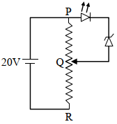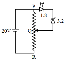 A potential divider circuit is connected with a dc source of $20 \mathrm{~V}$, a light emitting diode of glow in voltage $1.8 \mathrm{~V}$ and a zener diode of breakdown voltage of $3.2 \mathrm{~V}$. The length (PR) of the resistive wire is $20 \mathrm{~cm}$. The minimum length of $P Q$ to just glow the LED is ........... $\mathrm{cm}$.