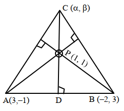 Two vertices of a triangle $\mathrm{ABC}$ are $\mathrm{A}(3,-1)$ and B $(-2,3)$, and its orthocentre is $\mathrm{P}(1,1)$. If the coordinates of the point $C$ are $(\alpha, \beta)$ and the centre of the circle circumscribing the triangle $\mathrm{PAB}$ is $(h, k)$, then the value of $(\alpha+\beta)+2(h+k)$ equals :