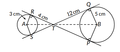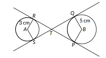 In the fig, RTP and STQ are common tangents to the two circles with centres $A$ and $B$. The radii of the two circles are 3 cm and 5 cm respectively. If $S T$ : TQ $=1: 3$ and $R T=4 \mathrm{~cm}$. Find the length of $Q T$ and $A B$.