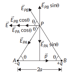 Electric field on the equatorial line of an electric dipole: Magnitude of electric field at any point on the perpendicular bisector of an electric dipole at distance $r$ from its centre is, $E_{\text {net }}=E_x$