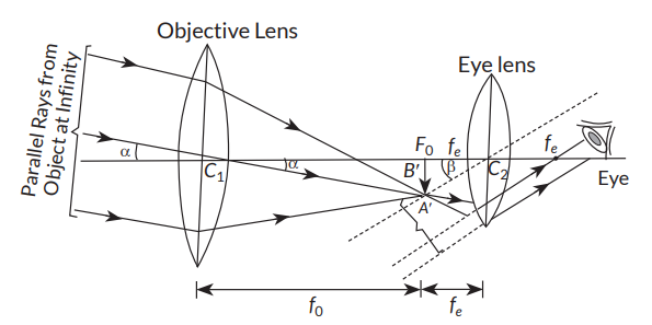 As the object lies at very huge distance, therefore, angle subtended by the object at $C_2$ (where eye is held) is almost the same as the angle subtended by the object at $C_1$ (because $C_1$ is close to $C_2$ ), i.e. $\angle A^{\prime} C_1 B^{\prime}=\alpha$. Rays coming from the final image at infinity make $\angle A^{\prime} C_2 B^{\prime}=\beta$ on the eye. Therefore, by definition