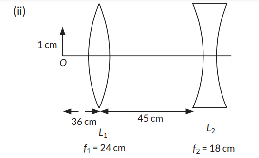 (ii) Two thin lenses $L_1$ and $L_2, L_1$ being a convex lens of focal length 24 cm and $L_2$ a concave lens of focal length 18 cm are placed coaxially at a separation of 45 cm . A 1 cm tall object is placed in front of the lens $L_1$ at a distance of 36 cm . Find the location and height of the image formed by the combination.