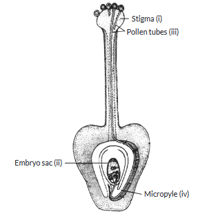 Label (i) stigma, (ii) embryo sac, (iii) pollen tube (iv) micropyle.